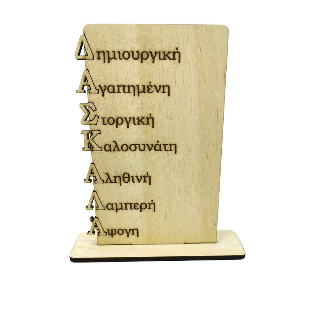 Ξύλινο αναμνηστικό στάντ με τα γράμματα της λέξης “ΔΑΣΚΑΛΑ” να είναι αρχικά σε λέξεις αγάπης προς το πρόσωπό της.